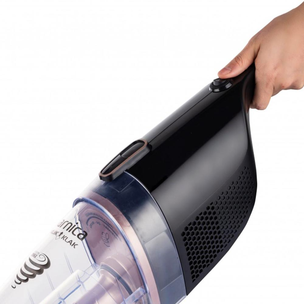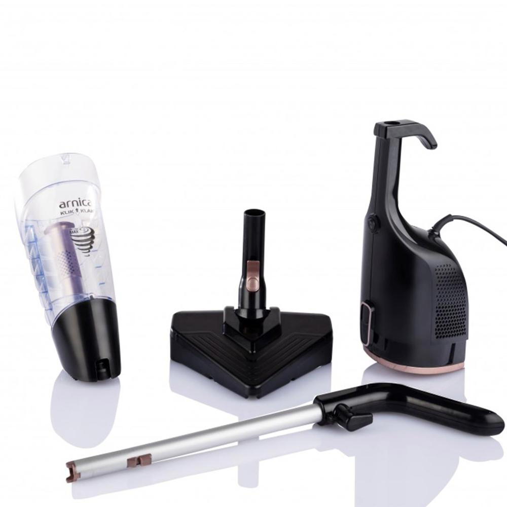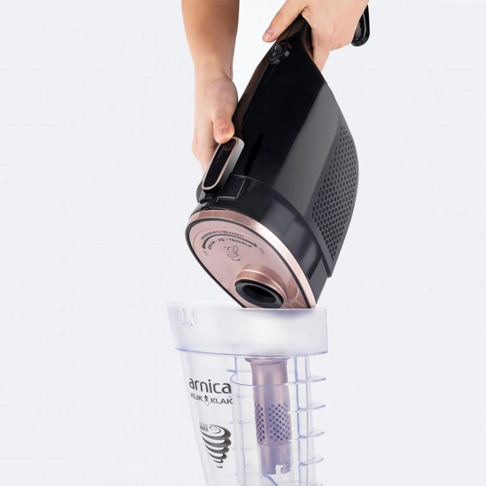 Arnica Klik Klak ET13331 Cyclone 600 W Dikey Süpürge Arnica Klik Klak ET13331 Cyclone 600 W Dikey SüpürgeŞık tasarımı ve canlı rengi ile öne çıkmayı başaran Arnica Klik Klak Kuru Dik Elektrikli Süpürge, temizlik işlerini kolay ve pratik bir hale getirir. Ergonomik yapısı, ideal boyutları ve hafifliği ile evlerinizde ve ofislerinizde tercih etmek isteyeceğiniz süpürge, işlerinizde hız kazanmanıza yardımcı olarak zamandan tasarruf sağlar.Klik Klak Kuru Dik Elektrikli Süpürge , katlanabilme özelliği ile kolaylık sunan patentli sapa sahiptir. Patentli ve ayarlanabilir olan entegre teleskobik boruyu temizlik esnasında ihtiyaç duyduğunuz seviyeye tek hamlede getirebilirsiniz. Tasarımı ile zahmetsiz bir süpürme işlemi sağlayan dikey süpürge, 3 farklı noktadan olan emiş sistemi ile yüksek bir performans sergiler. Makinenin üstün performanslı yeni süpürme ucu sayesinde kısa sürede etkili sonuçlar alabilirsiniz.Dikkatleri üzerine çeken Arnica Klik Klak Kuru Dik Elektrikli Süpürge sahip olduğu hepa ve mikro filtre ile yabancı maddeleri ayrıştırır. Toz, evcil hayvan tüyü, yemek kırıntısı, saç gibi maddeleri temizleme haznesinde toplayan dik süpürge, hijyenik sonuçlara ulaşmanızı kolaylaştırır. Çift filtreli makinenin temizleme haznesini gerektiğinde pratik bir şekilde temizleyebilirsiniz. A enerji sınıfına sahip süpürgeyi hemen sepetinize ekleyerek ürüne kolaylıkla sahip olabilirsiniz. Arnica Klik Klak ET13331 Cyclone 600 W Dikey Süpürge Özellikleri