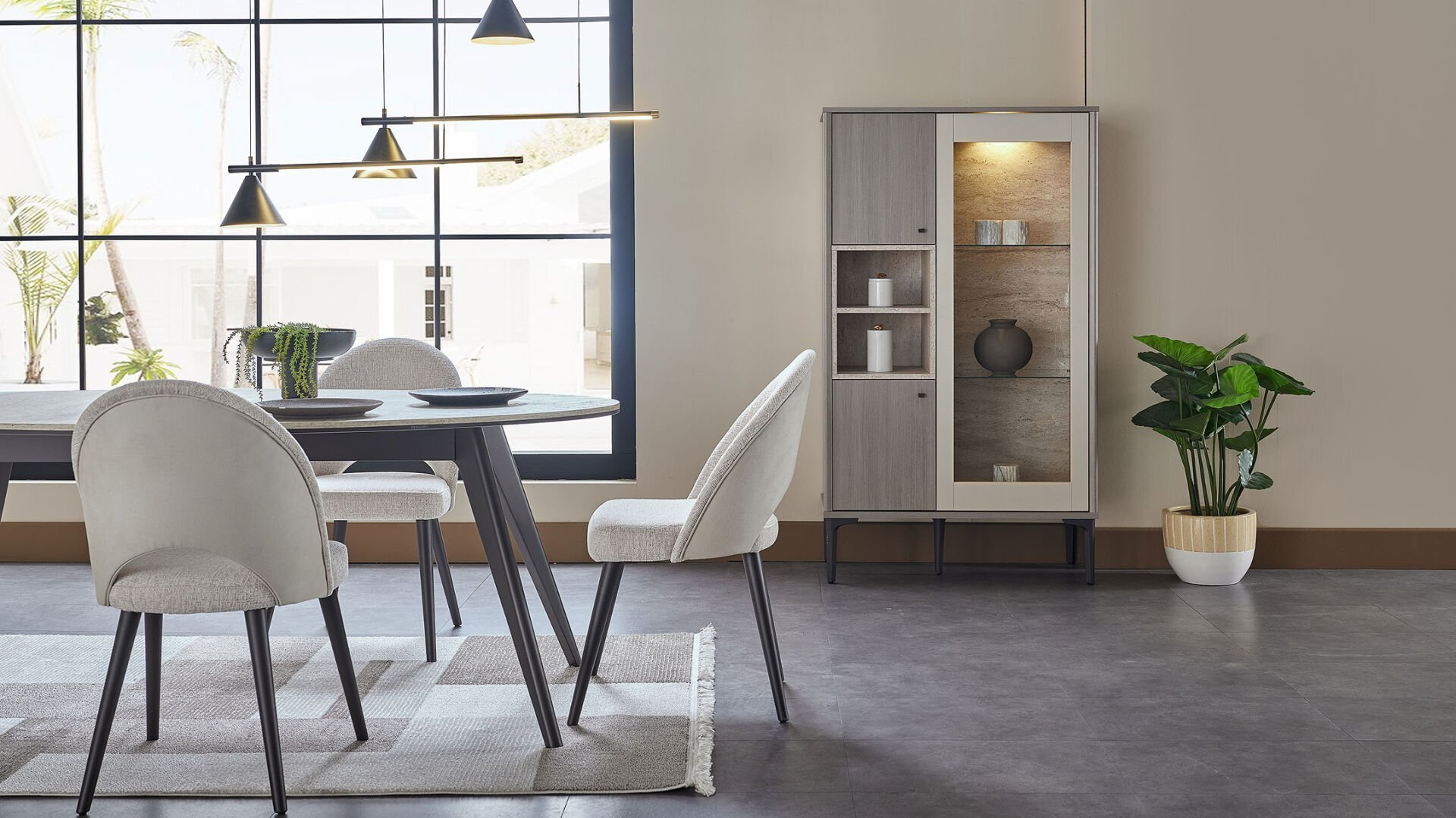 Takım içerisinde yer alan geniş yemek masası, kalabalık yemek davetlerinizi rahatlıkla karşılayabilecek boyuttadır. Sandalyelerin ergonomik yapısı sayesinde, uzun süren yemeklerde rahatlıkla oturabilirsiniz. Ayrıca, saklama alanı sunan vitrin, yemek takımlarınızı ve göz alıcı eşyalarınızı sergileyerek dekorasyonunuza şıklık kazandırır.
