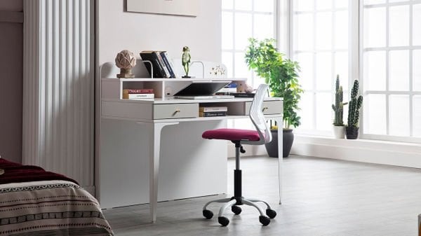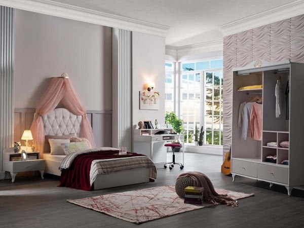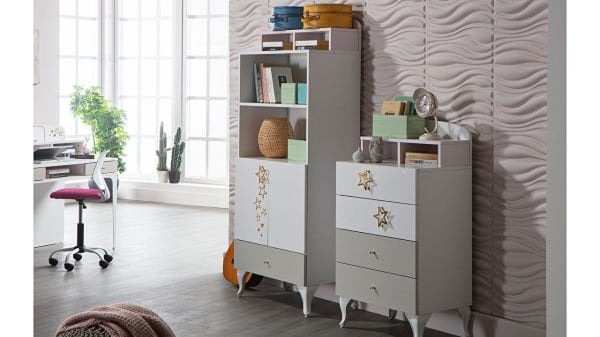 Takımın tamamlayıcı parçası olan çalışma masası, zengin depolama alanı ve ergonomik tasarımı ile gençlerin ders çalışırken rahat ve verimli bir ortamda olmalarına yardımcı olur. Masanın yanında, kitaplara, kırtasiye malzemelerine ve diğer eşyalara yerleştirilebilecek şık bir raflı kitaplık da bulunmaktadır.