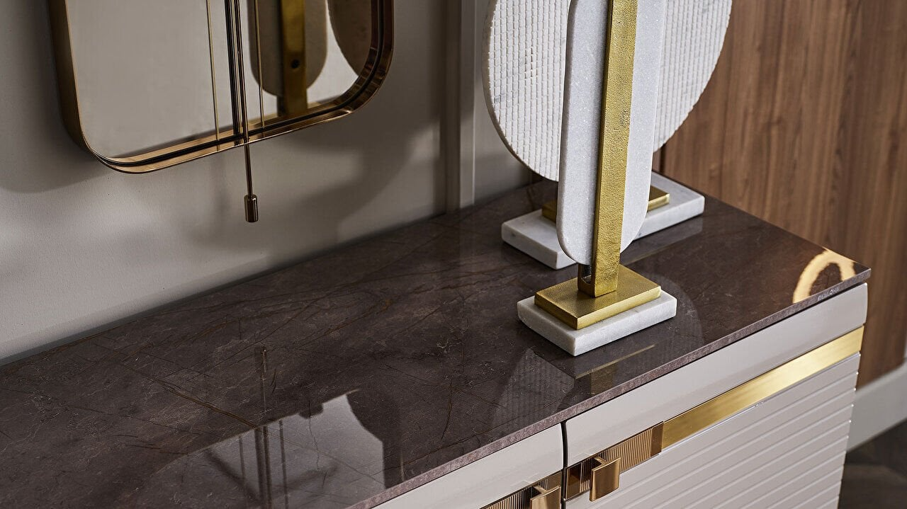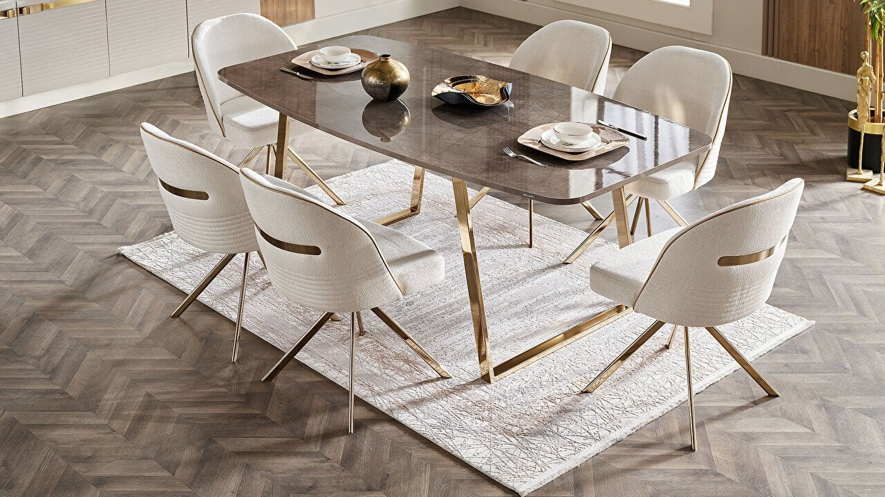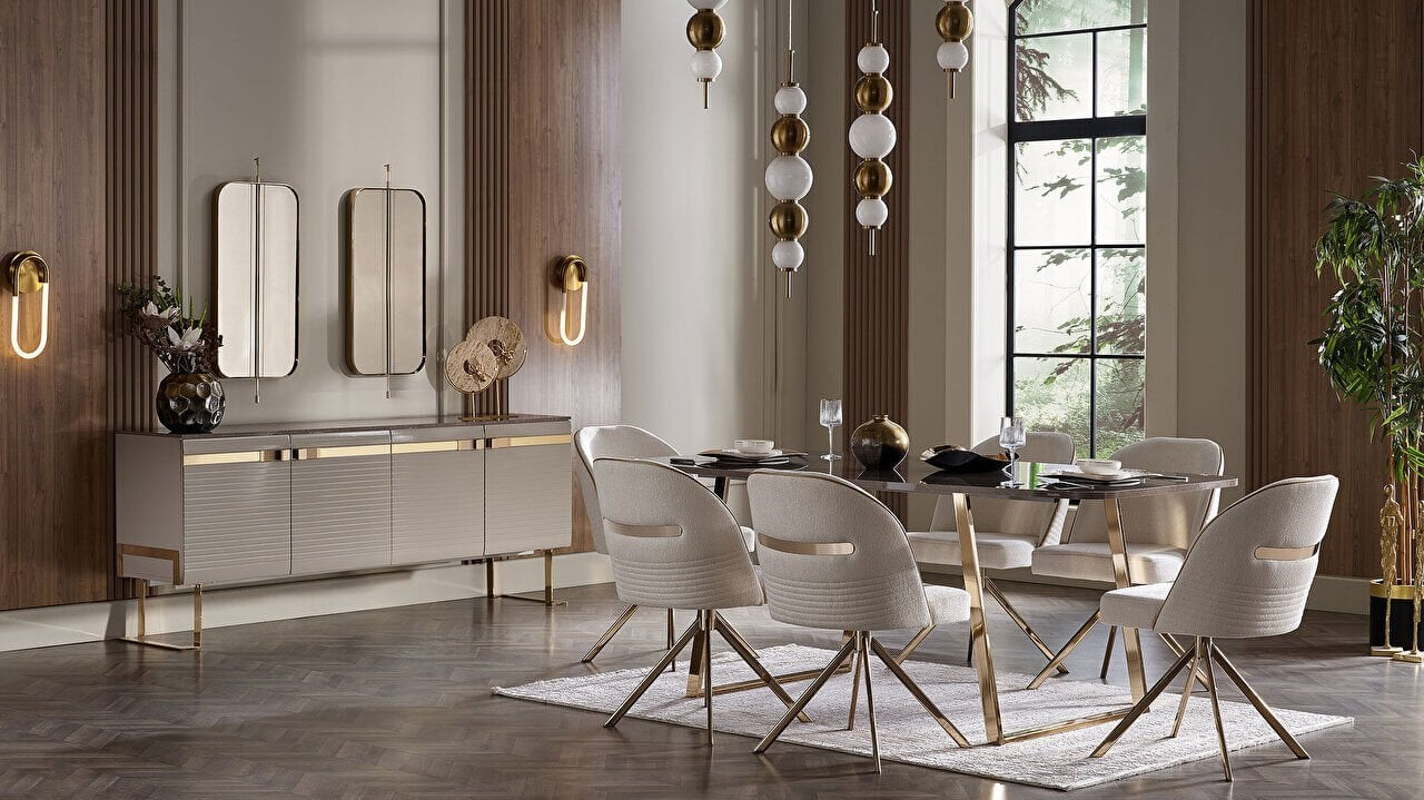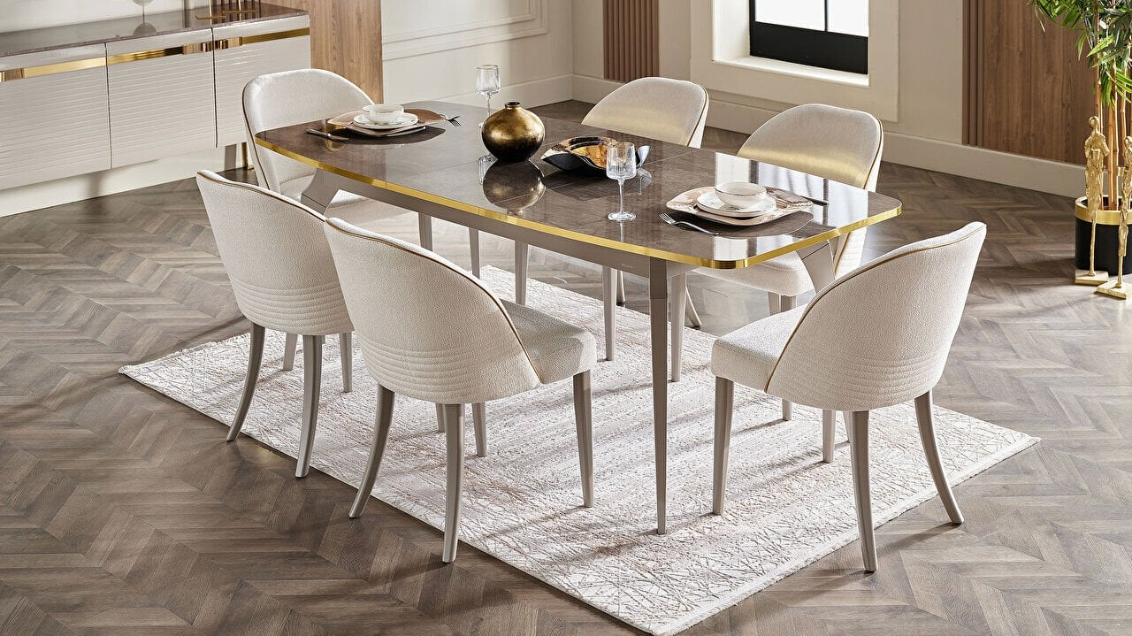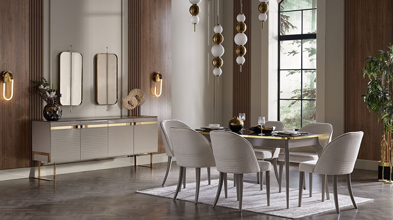 Veronica Yemek Odası Takımı, zarif hatları ve modern dokunuşlarıyla her evin tarzına uyum sağlar. Göz alıcı ahşap yüzeyleri ve şık metal aksanları, mekânınıza sıcak bir atmosfer katarken, yemek masasına yerleştirilen lüks sunumlarınız için mükemmel bir zemin oluşturur. Takımın renk seçenekleri, farklı dekorasyon stilleriyle kolayca kombinlenebilir.