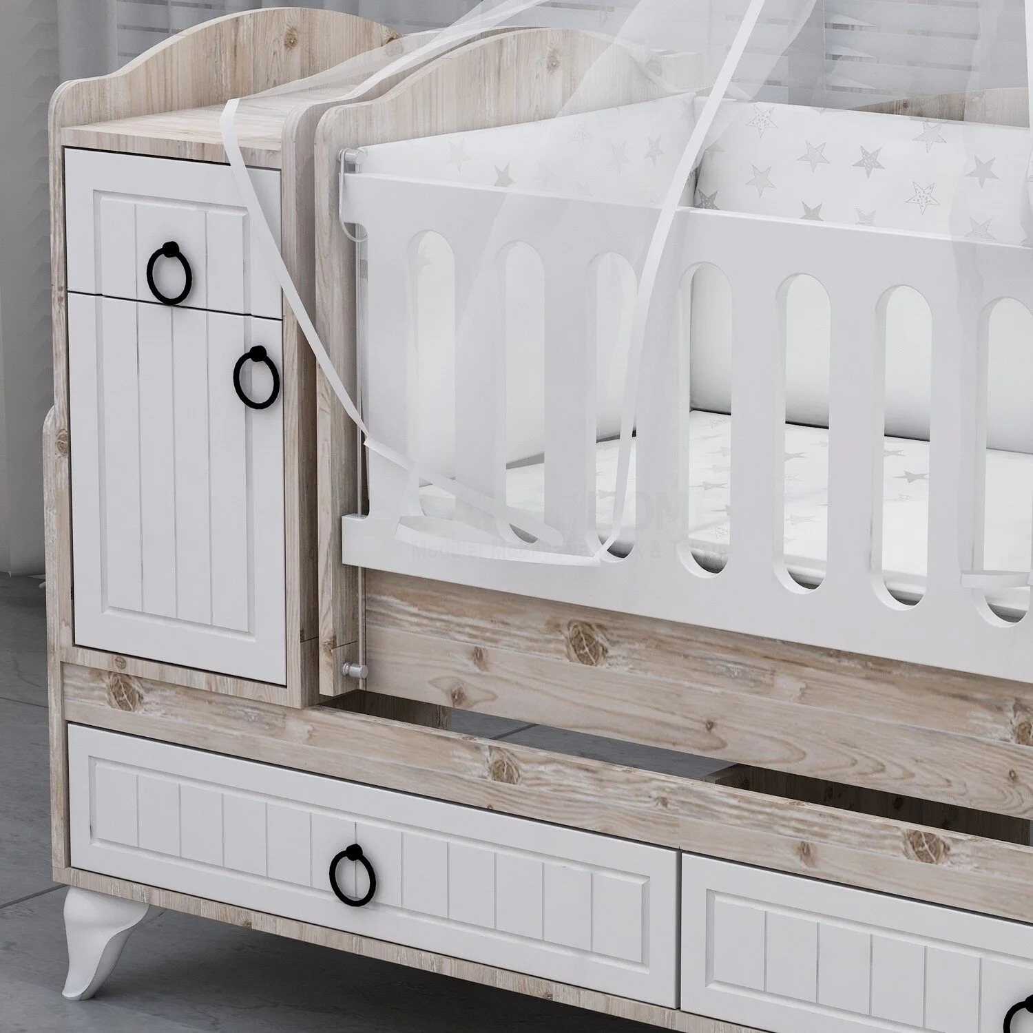 Asansör Özelliği İlk 6 ay tüm annelerin bebeğini beşiklerine daha rahat ve kolay yatırabilmeleri için beşiğimizin ön korkuluğunu asansörlü olarak üretmekteyiz.