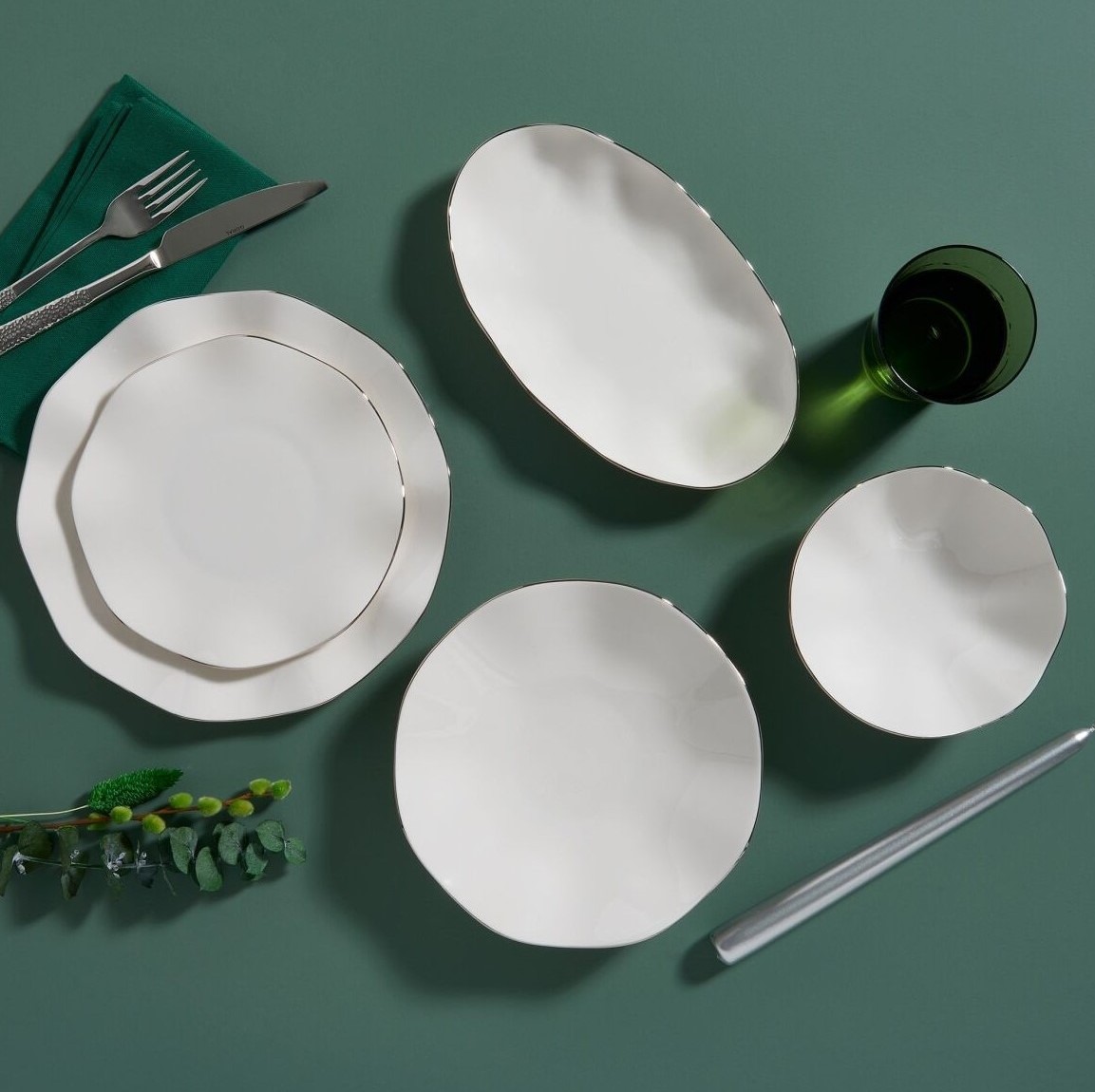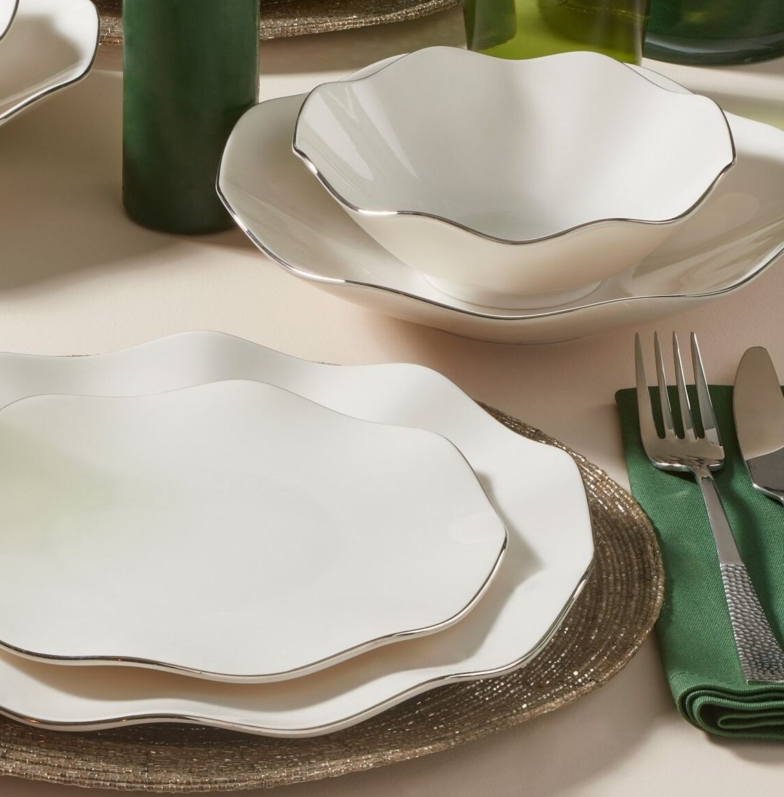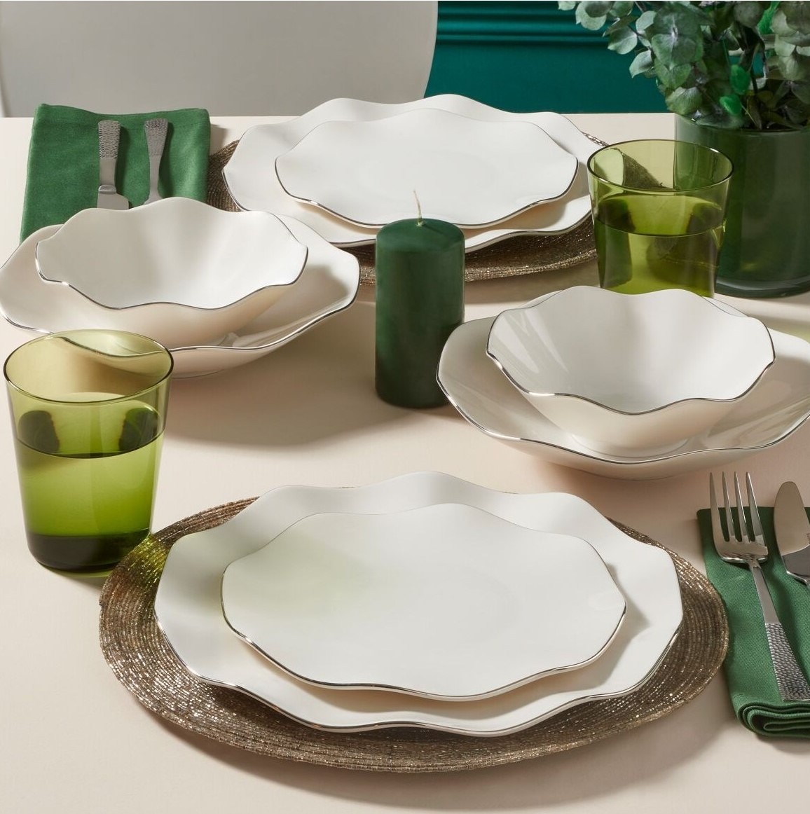 Bone krem rengi, Nesrin'e sade ve sofistike bir hava katarken, gümüş file detayları modern tasarımını vurguluyor. Her parçasında incelikle işlenen bu detaylar, sofranıza özel bir dokunuş ekliyor