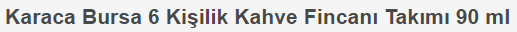 Karaca Bursa 6 Kişilik Kahve Fincanı Takımı 90 ml Set İçeriği 6 Adet Kahve Fincanı (90 ml) 6 Adet Kahve Fincan Tabağı Malzeme: Porselen Elde yıkanması tavsiye edilir.