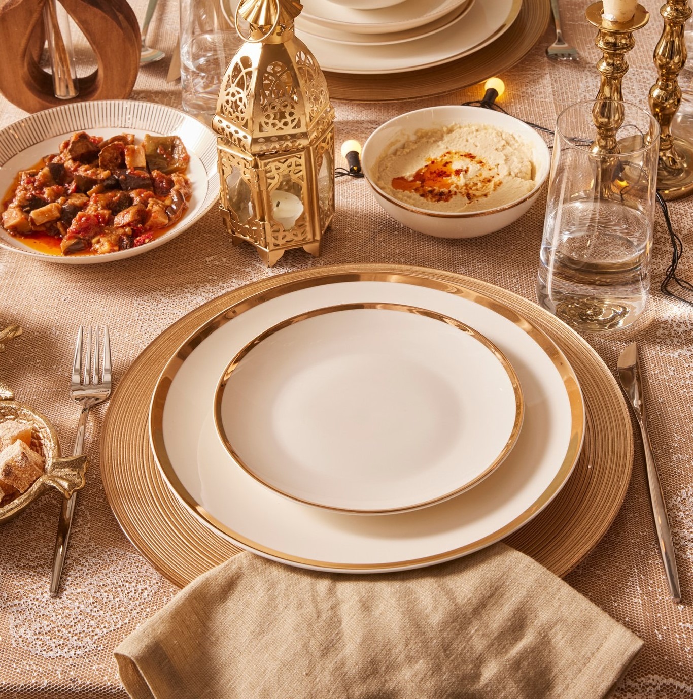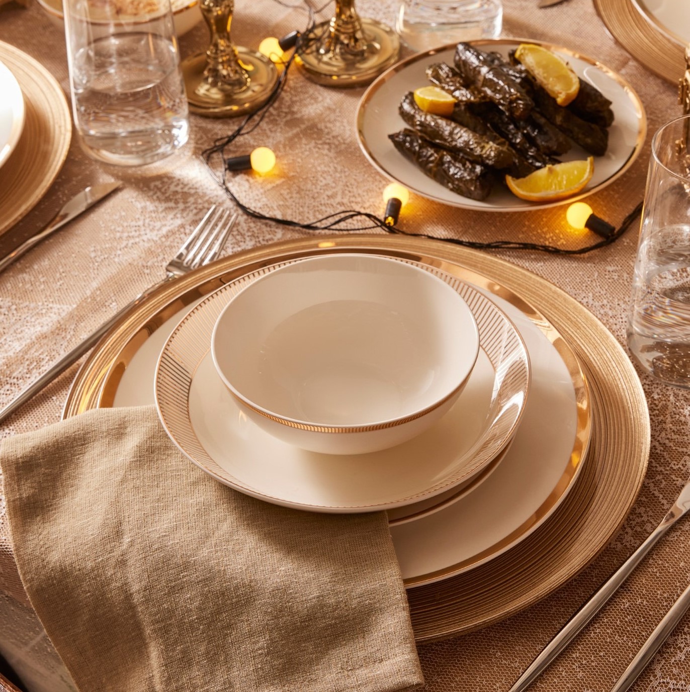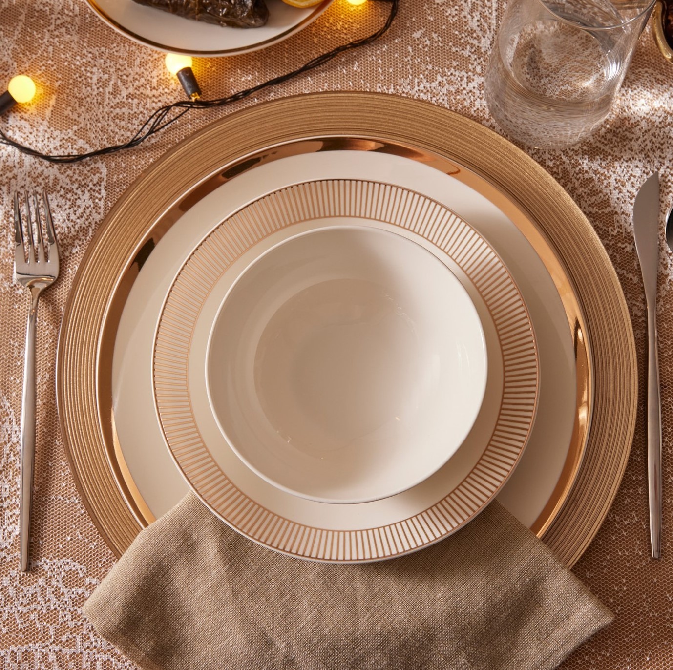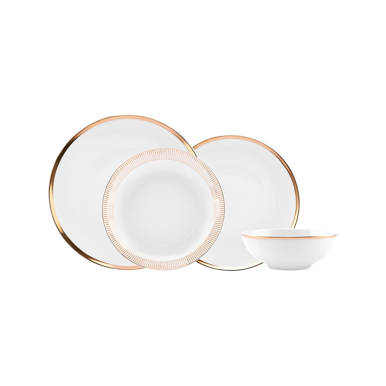 Karaca Almond Gold Line 24 Parça 6 Kişilik Yemek Takımı Set İçeriği; 6 ADET SERVİS TABAĞI 27 CM, 6 ADET ÇUKUR TABAK 22 CM, 6 ADET PASTA TABAPI 19 CM, 6 ADET KASE 14 CM Malzeme; Porselen |