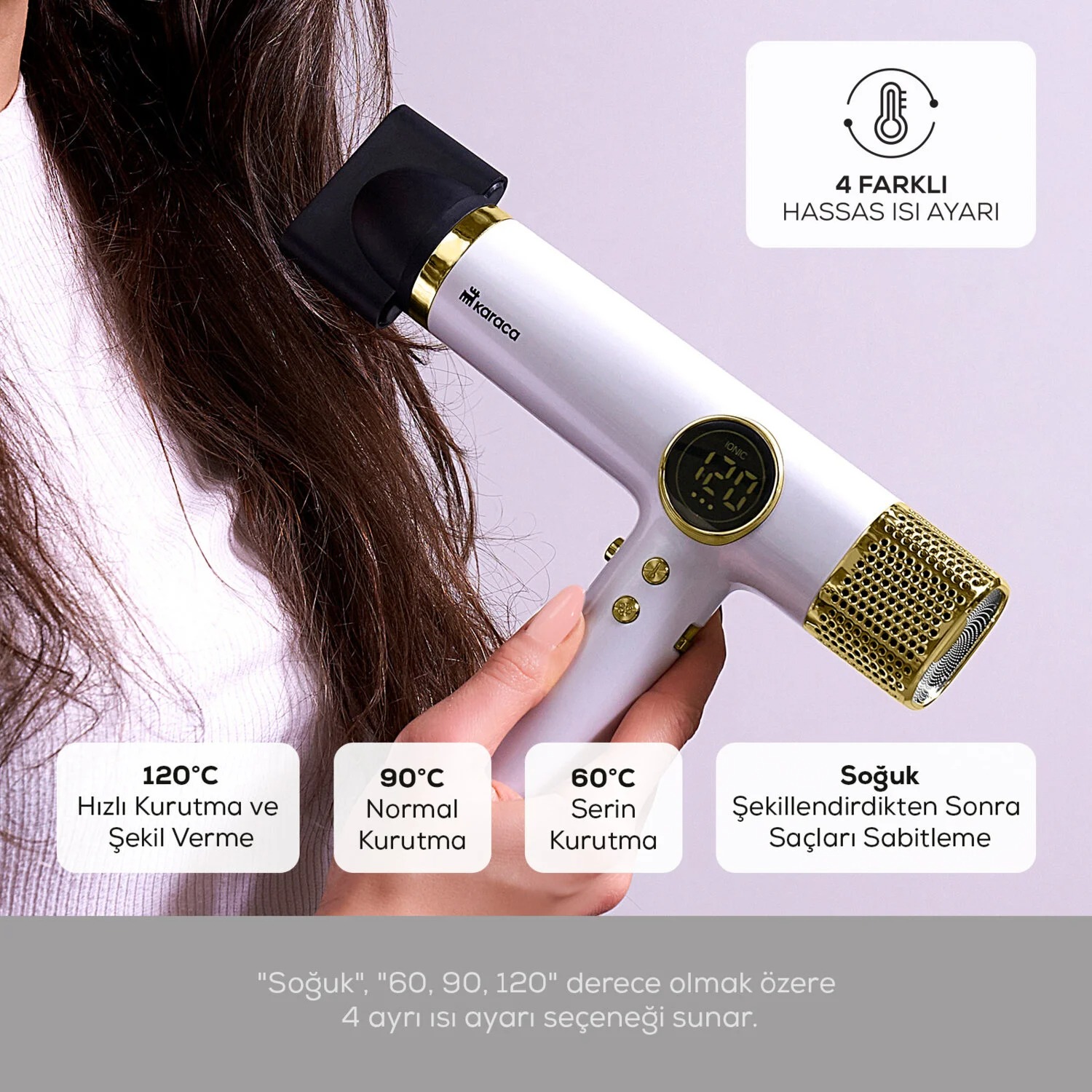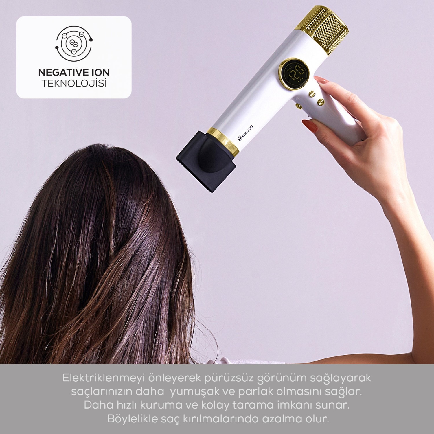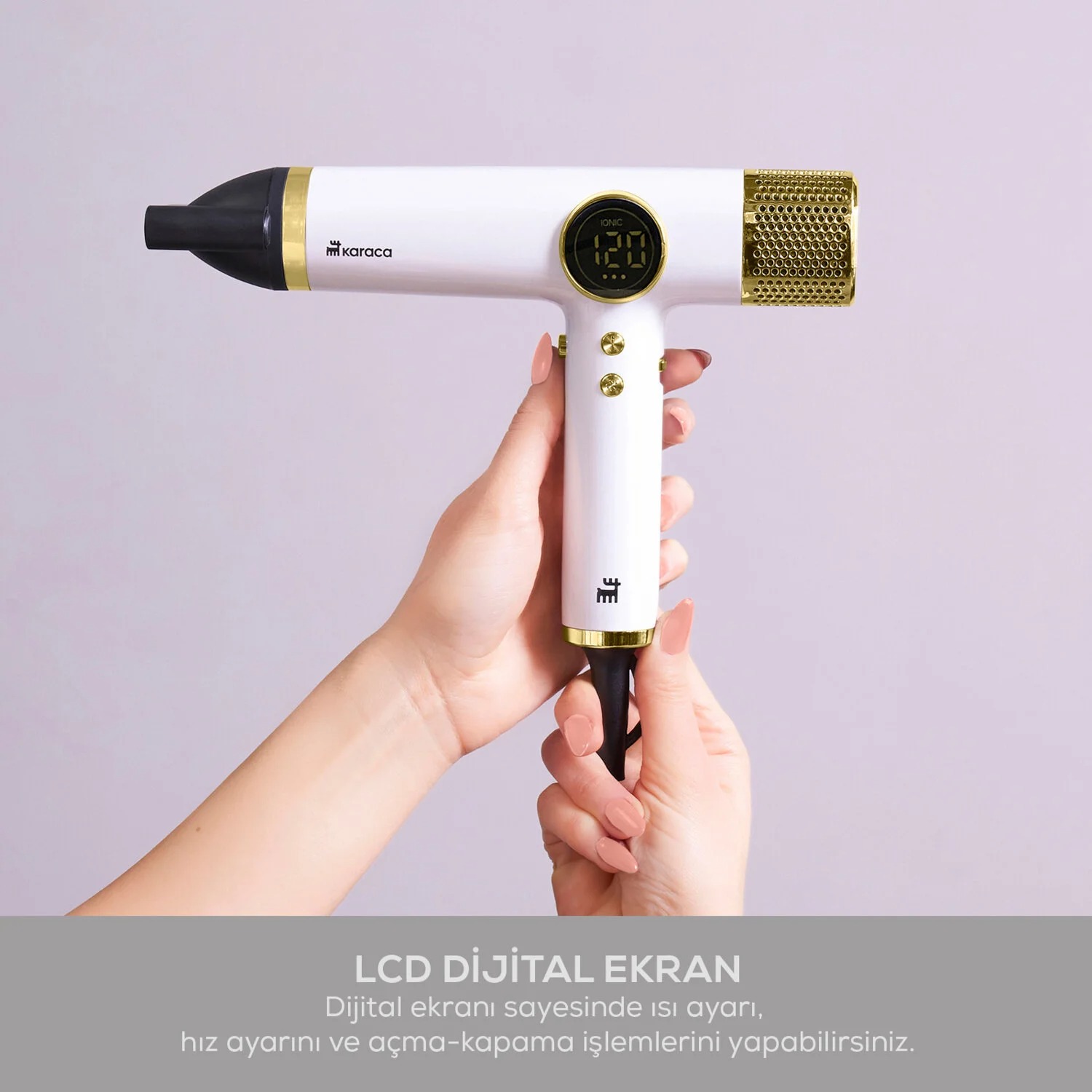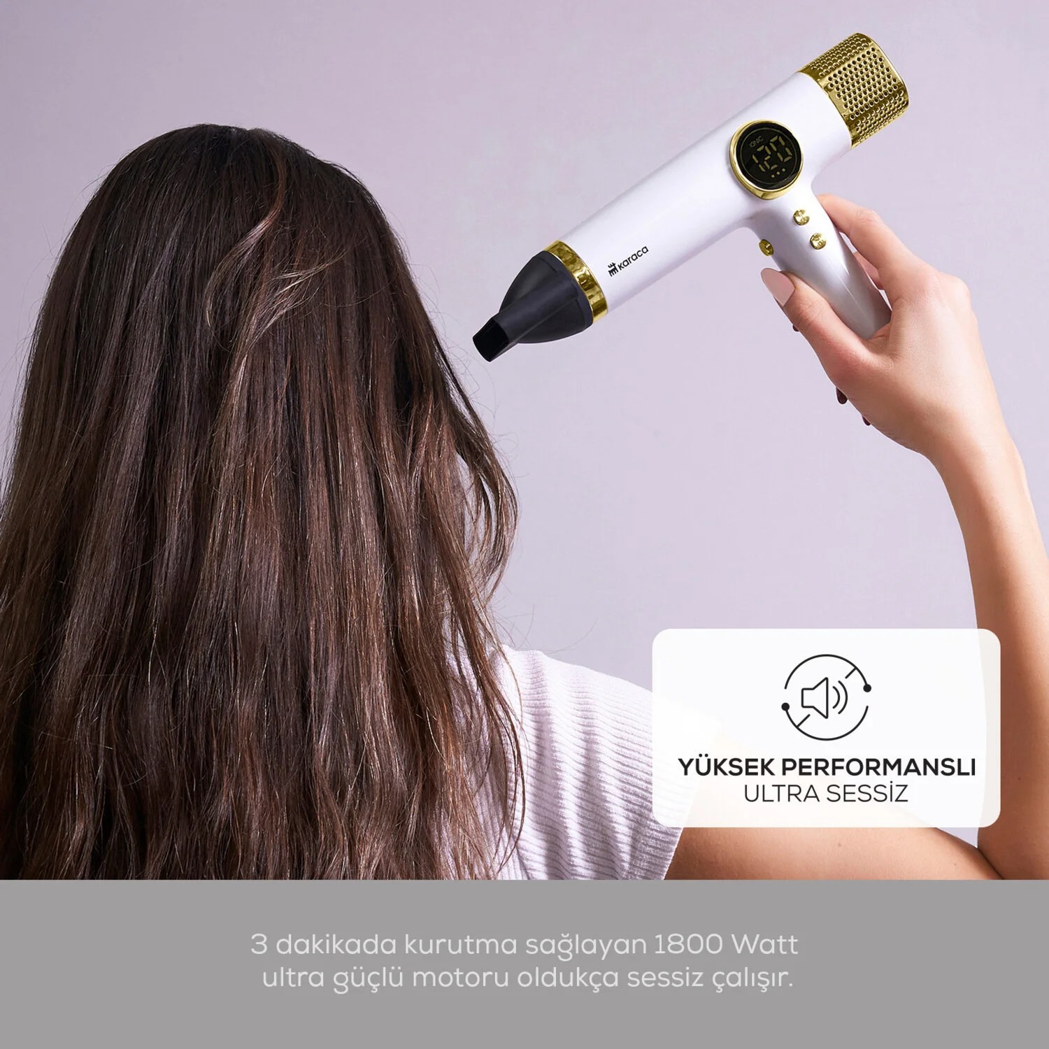 Karaca Hypersonic Saç Kurutma Makinesi D6 Water ION Beyaz Gold NEGATIVE ION TECHNOLOGY 30 milyon negative ion içeren teknolojisi ile statik elektriği etkili bir şekilde giderir ve elektriklenmeyi önler. Saçınıza pürüzsüz parlak bir görünüm kazandırarak kolay taramanızı sağlar. 360 DERECE DÖNEBİLEN ŞEKİLLENDİRİCİ BAŞLIK 360 derece dönebilen manyetik, mıknatıslı başlığı size kullanım kolaylığı sağlarken saçınızın da kolayca şekil almasını sağlar. LCD DIGITAL EKRAN Karaca Hypersonic D6 Saç Kurutma Makinesi’nin LCD ekranında 4 farklı ısı ayarı ile 3 farklı hız ayarını tek dokunuşla kontrol edebilirsiniz. 4 HASSAS ISI AYARI "Soğuk", "60, 90, 120" derece olmak özere 4 ayrı ısı ayarı ile saçınızı şekillendirmeye yardımcı olur. 3 FARKLI HIZ AYARI 3 farklı hız ayarı ile istediğiniz hızda saç kurutma ve şekillendirme imkanı sunar. 3 FARKLI ŞEKİLLENDİRME BAŞLIĞI İki farklı kurutma başlığı ile, saçlarınız istediğiniz gibi kusursuz bir şekle ve parlak bir görünüme kavuşur. Difüzör şekillendirme başlığı ise bukleleri ve dalgaları belirginleştirmeye yardımcı olurken kabarmayı ve elektriklenmeyi önler. ERGONOMİK TASARIM Ergonomik tasarımı ile küçük ve hafiftir. Seyahatlerinizde de güvenle kullanabilirsiniz. YÜKSEK PERFORMANSLI ULTRA SESSİZ Karaca Hypersonic D6 Saç Kurutma Makinası 1800 Watt BLDC motoru ile yüksek performans gösterirken; düşük ses seviyesi ile size günün her saatinde saç kurutma imkanı verir. Saçınızın yalnızca 3 dakika içinde kurutarak daha hızlı saç kurutma deneyimi sağlar. ULTRA UZUN GÜÇ KABLOSU 3 metre kablosu saçınızı kuruturken rahat hareket imkanı sağlar. ÇIKARILABİLİR HAVA GİRİŞİ Kolayca takılıp çıkarılabilen hava girişi zahmetsiz, kolay temizlik imkanı verir. |