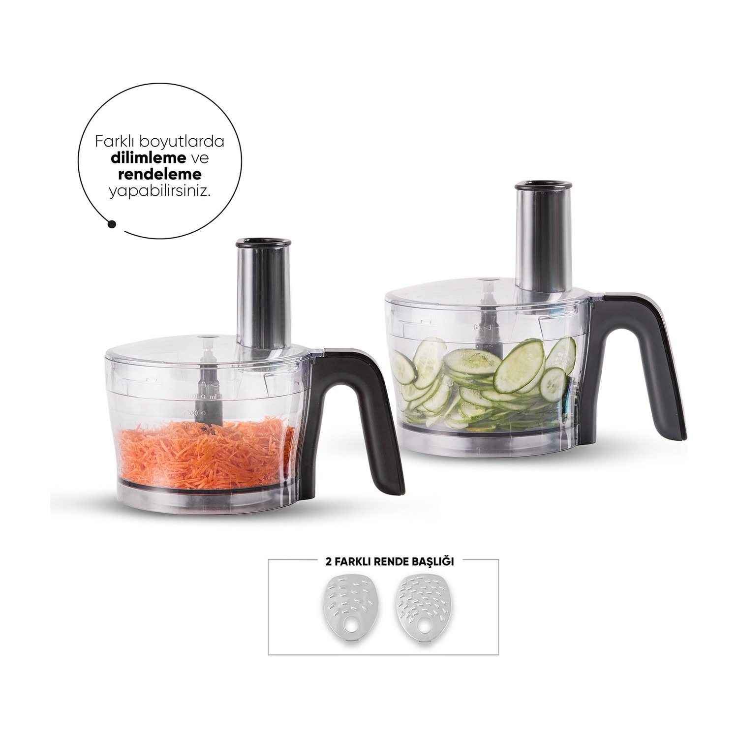 - 2 farklı paslanmaz çelik rende başlığı ile meyve, sebze ve sert peynirleri farklı şekillerde dilim ve rendeleyebilirsiniz