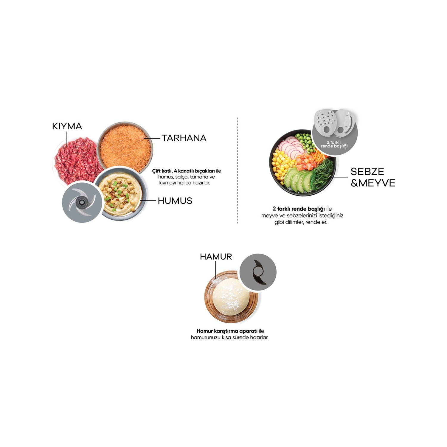 - Çift katlı, 4 kanatlı doğrayıcı bıçakları üstün doğrama performansı sağlar. Böylelikle humus, salça, kıyma ve tarhana gibi yiyeceklerinizi hızlıca hazırlayabilirsiniz.