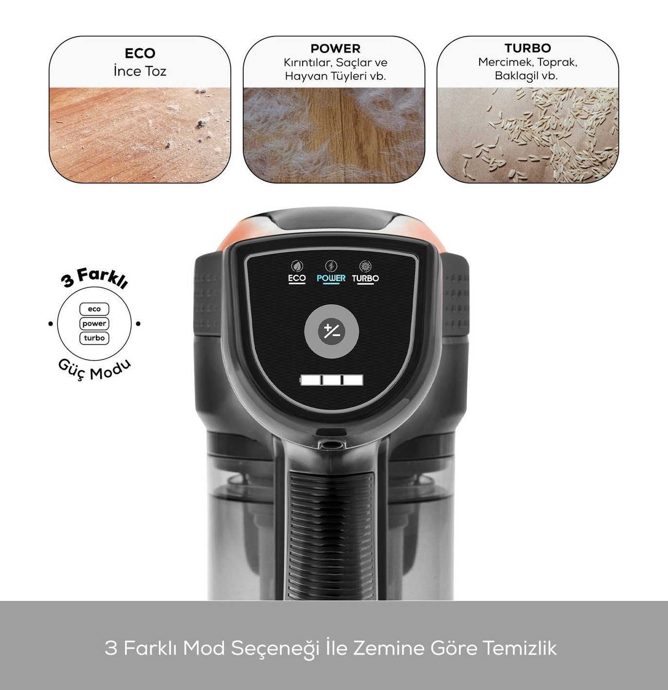 - Eco, Power ve Turbo olarak üç farklı moda sahip Vantuz Power Force Pro, zemin ve kir tipine göre modlar arasında