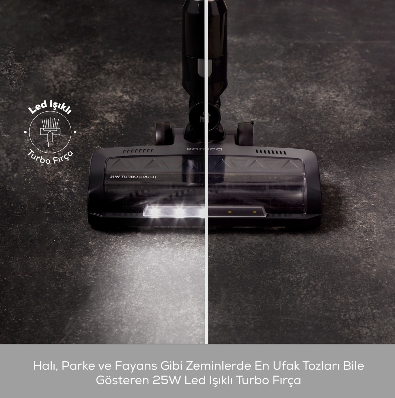 - 25 W motor gücünde LED ışıklı turbo fırçası, tüm zeminlerde en ufak tozları bile göstererek derinlemesine