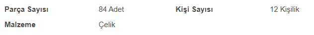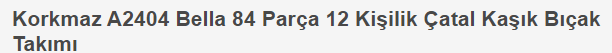 Korkmaz A2404 Bella 84 Parça 12 Kişilik Çatal Kaşık Bıçak Takımı 84 Parça - Kutulu 12 adet yemek kaşığı 12 adet yemek çatalı 12 adet yemek bıçağı 12 adet tatlı kaşığı 12 adet tatlı çatalı 12 adet tatlı bıçağı 12 adet çay kaşığı 18/10 Cr-Ni Paslanmaz Çelik Parlaklığını koruyan özenle polisajlanmış dış yüzeyler İlk kullanımdan önce sıcak su bulaşık deterjanı ile temizleyiniz. Temizlik esnasında sert metal fırçalar kullanmayınız Bulaşık makinesinde temizlenebilir |
