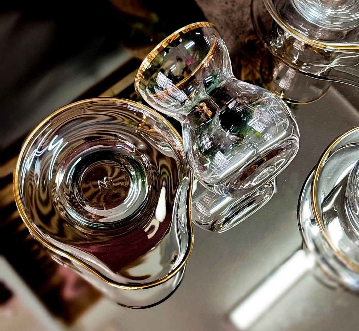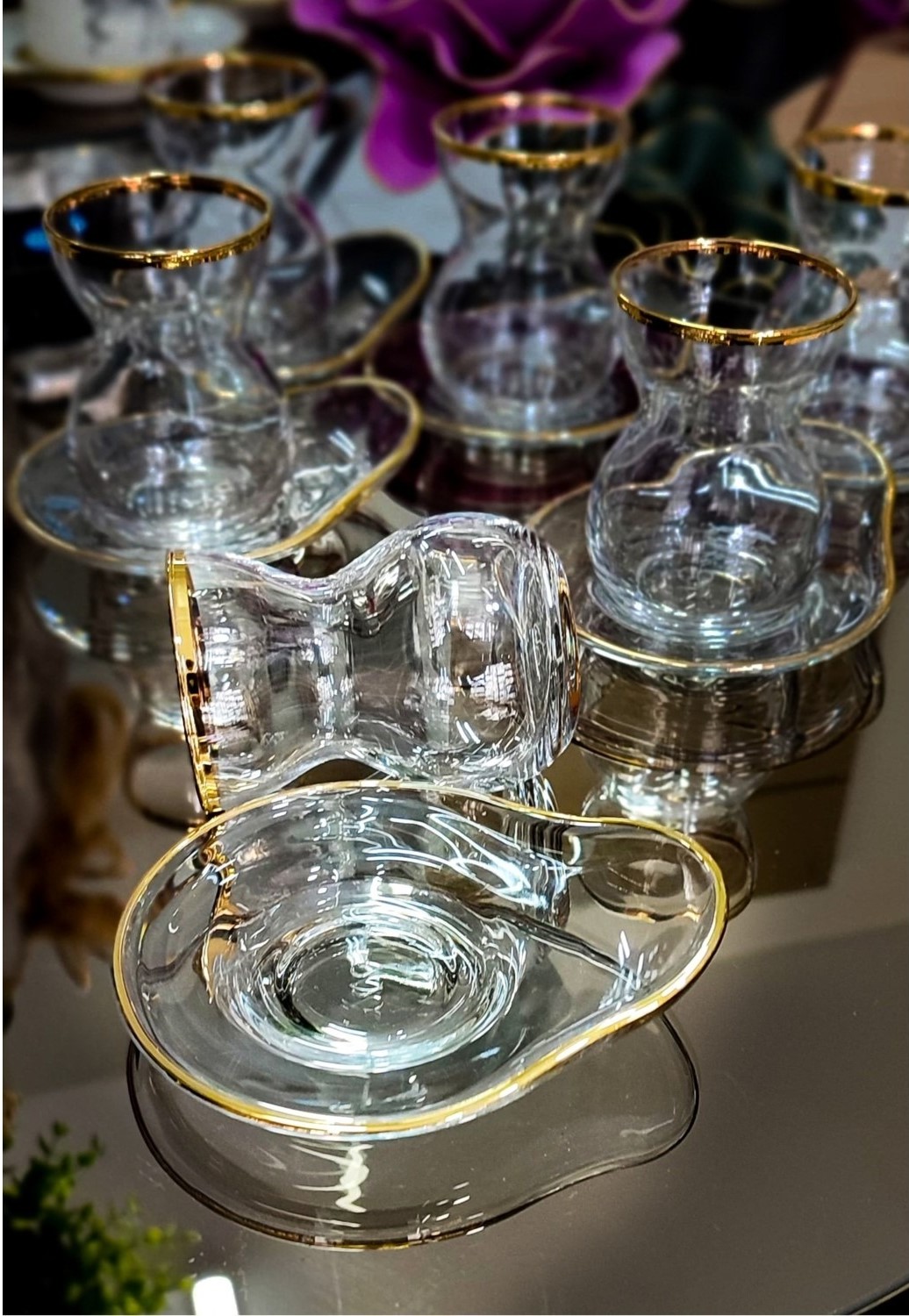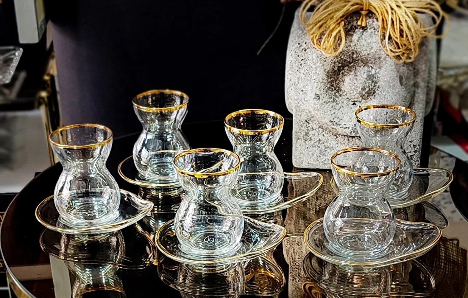 Elit Home özel tasarım Paşabahçe Tombik Çay Takımı Paşabahçe camıyla gerçek altın tonunun muhteşem uyumu Sıra dışı tabağıyla çok daha kolay kullanım imkanı