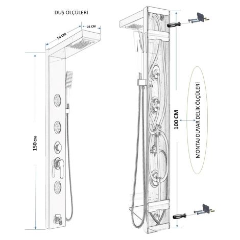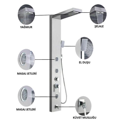 Duş seti ve duş kolonu da bu Duş Paneli'nin bir parçasıdır. Bu sayede, su akışını kolaylıkla kontrol edebilir ve istediğiniz gibi ayarlayabilirsiniz. Ayrıca, sabahları sizi canlandırmak veya akşamları rahatlatmak için farklı su çıkış seçeneklerinden faydalanabilirsiniz.