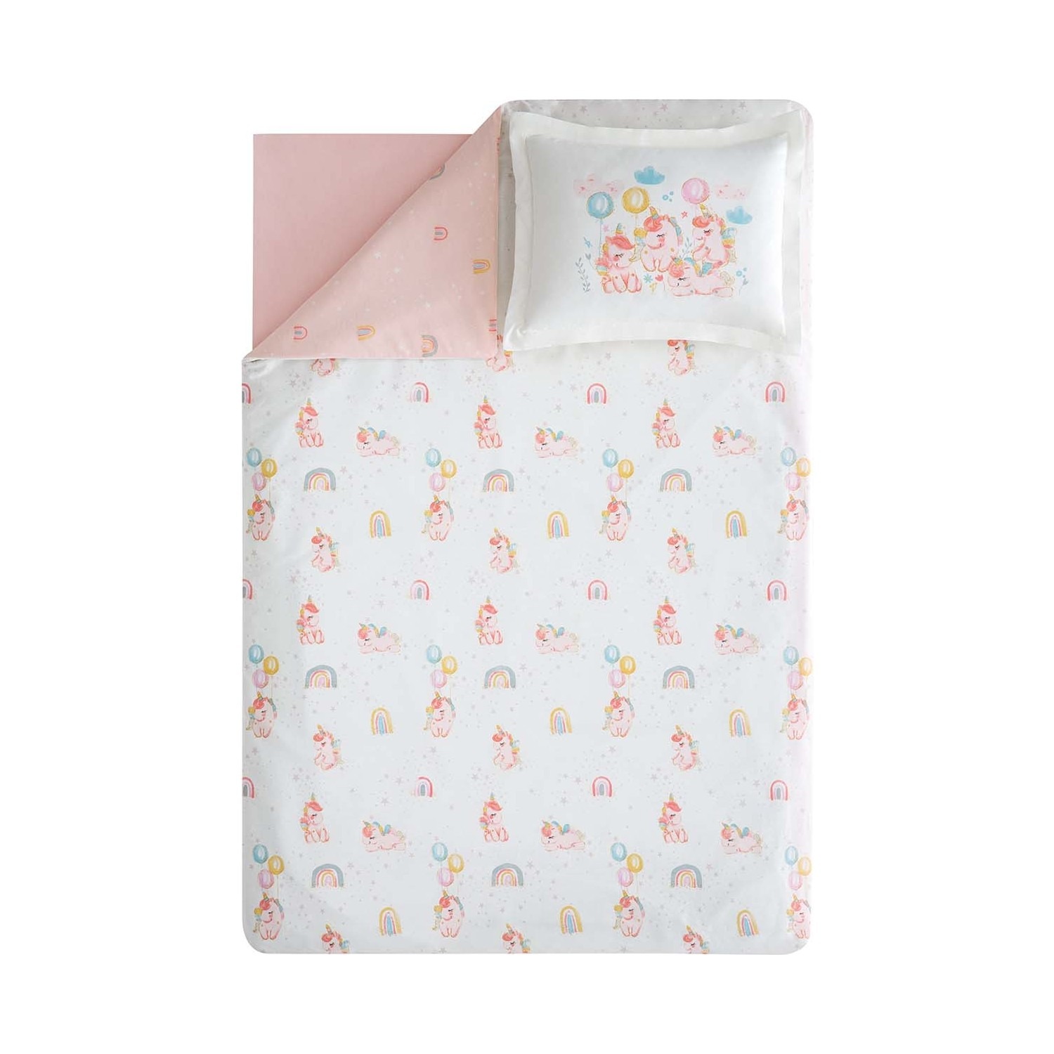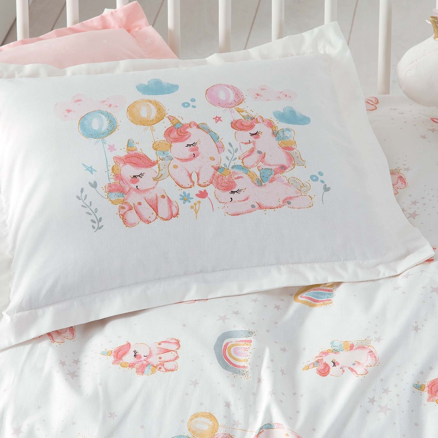 Pembe ve beyaz renklerin huzurlu birlikteliği ile bebekleri sakin bir uykuya hazırlayan Unicorn Bebek Nevresim Takımı, yumuşacık pamuk dokusu ile maksimum konfor sağlıyor.